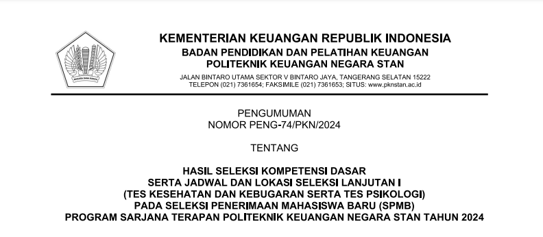 PENGUMUMAN HASIL SELEKSI SKD SERTA JADWAL DAN LOKASI SELEKSI LANJUTAN I (TES KESEHATAN DAN KEBUGARAN SERTA TES PSIKOLOGI) PADA SPMB PROGRAM SARJANA TERAPAN PKN "STAN" TAHUN 2024 |