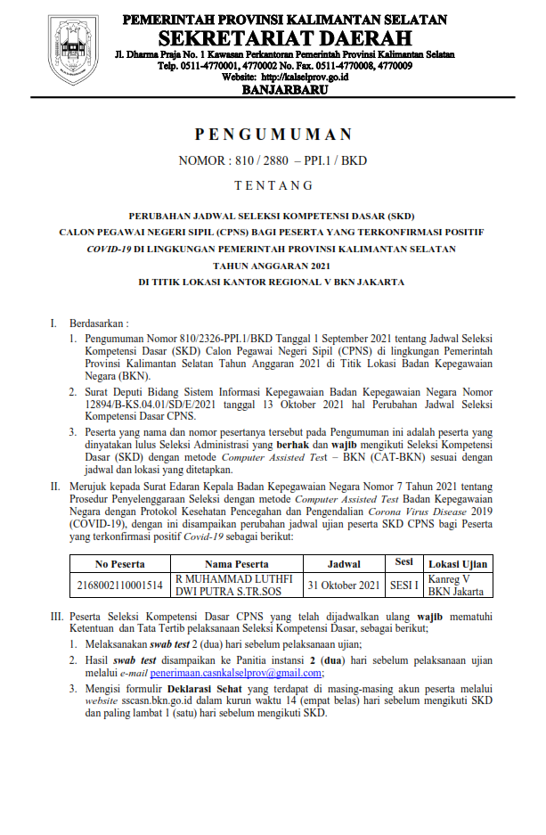 Pengumuman Perubahan jadwal SKD CPNS Peserta COVID Kanreg V BKN Jakarta
