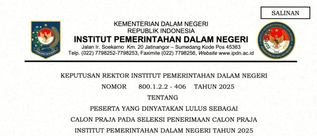 PESERTA YANG DINYATAKAN LULUS SEBAGAI CALON PRAJA PADA SELEKSI PENERIMAAN CALON PRAJA INSTITUT PEMERINTAHAN DALAM NEGERI TAHUN 2025