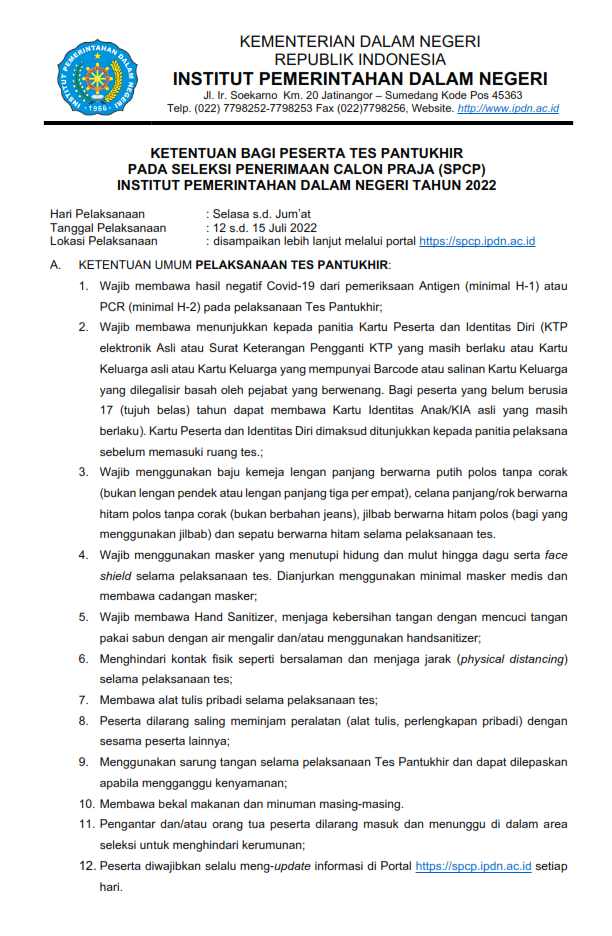 KETENTUAN BAGI PESERTA TES PANTUKHIR PADA SELEKSI PENERIMAAN CALON PRAJA (SPCP) INSTITUT PEMERINTAHAN DALAM NEGERI TAHUN 2022 |