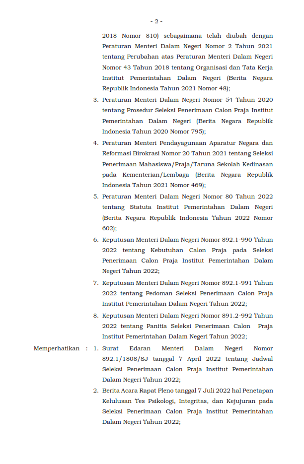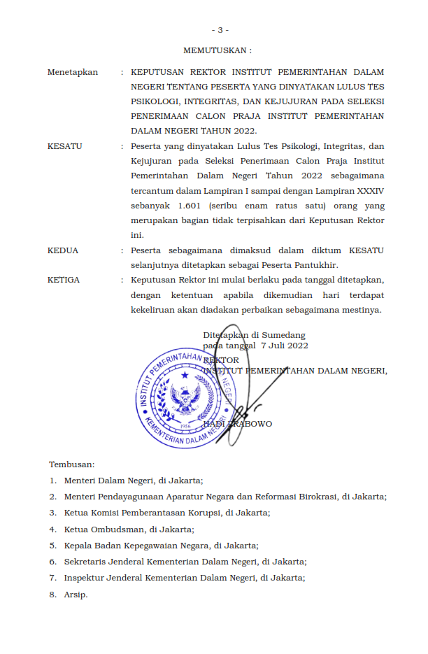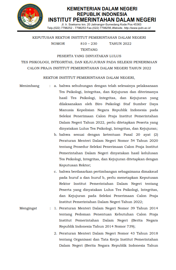 KEPUTUSAN REKTOR INSTITUT PEMERINTAHAN DALAM NEGERI NOMOR 810 – 230 TAHUN 2022 TENTANG PESERTA YANG DINYATAKAN LULUS TES PSIKOLOGI, INTEGRITAS, DAN KEJUJURAN PADA SPCP IPDN TAHUN 2022 |